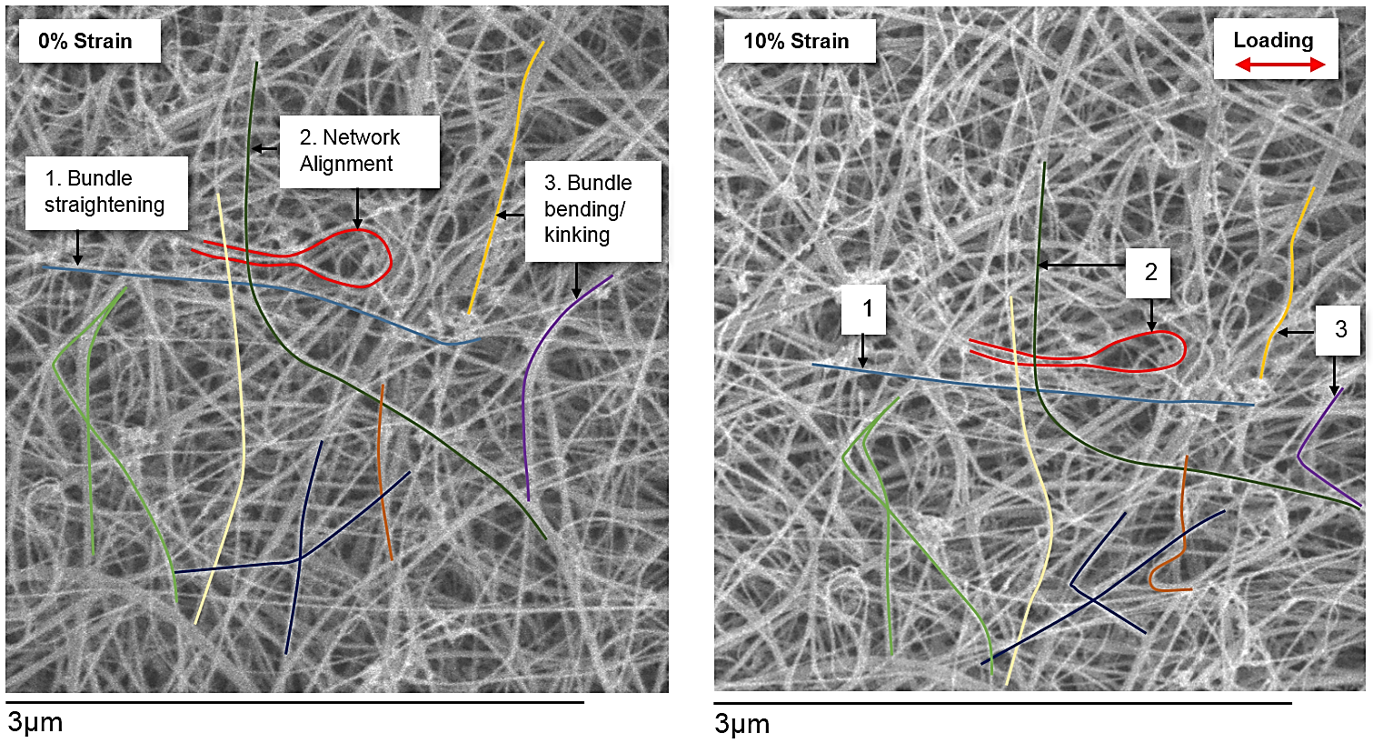 1) Achieved the first in-situ microscopy that reveals the deformation mechanisms of CNT mat. We found that CNT bundles form random interlinked bundle networks and the network deforms like a foam under tension, with dominant transverse deflection of struts. The lack of stretching on CNT bundles limits the macroscopic mechanical properties of CNT mat.