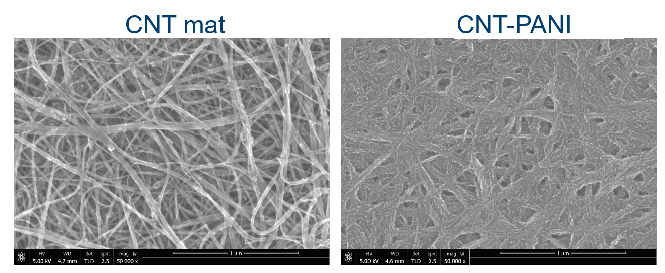 Novel direct-spun carbon nanotube polyaniline composite electrodes are developed for supercapacitor applications. Supercapacitors combine high specific power with cyclic stability. Consequently, they find application in regenerative braking systems and in other applications that require high power, short-term energy storage. The influence of charge and discharge rate, electrode composition and state of charge upon the mechanical and electrochemical properties of these novel electrode composites is currently unclear, as are the mechanisms of degradation upon cycling and pre-charging. These topics are addressed in our study.