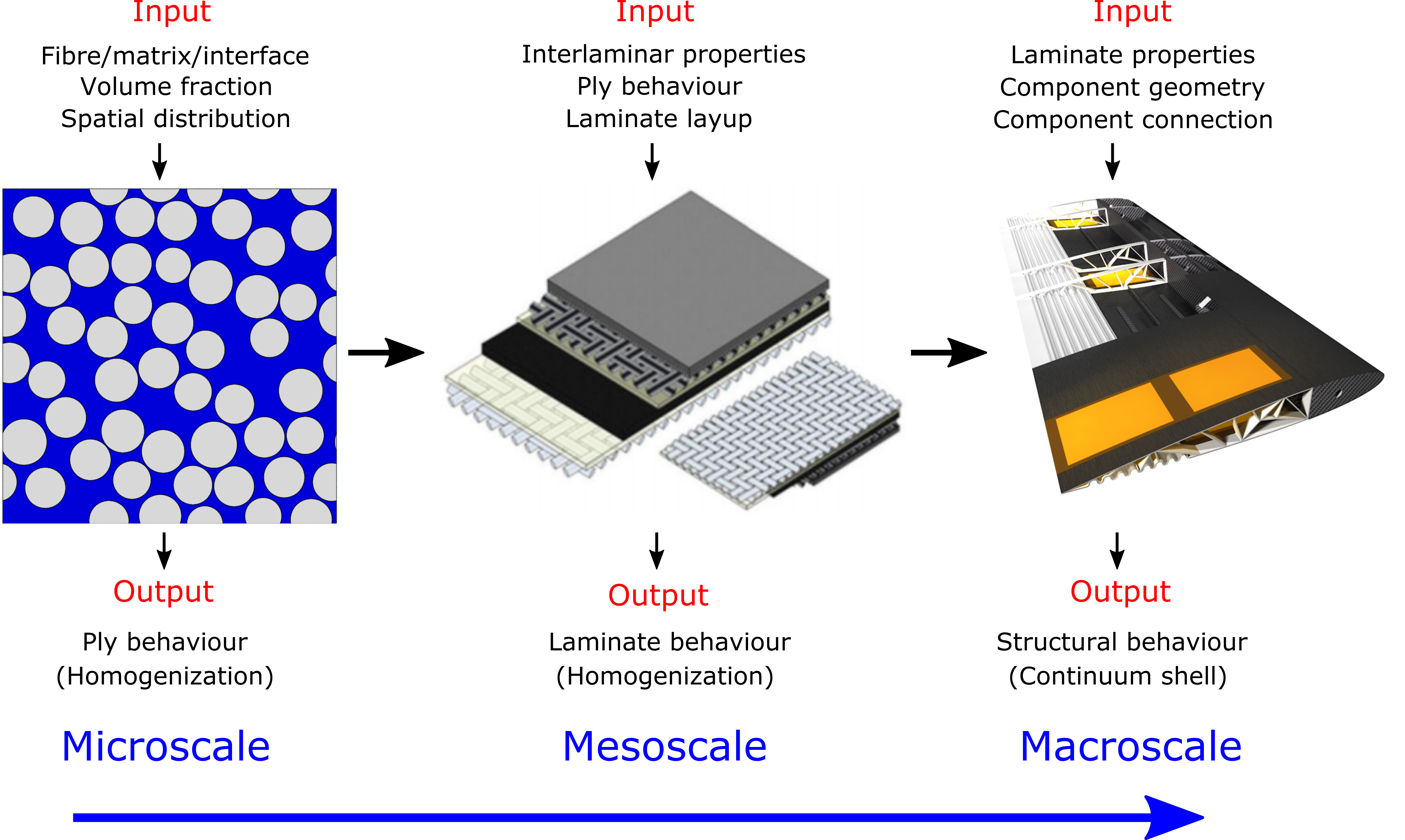1) A multiscale model was also proposed to take into account the physical mechanisms of deformation at different length scales of composite structures. This efficient strategy enables carrying out multiscale modelling from the properties of the constituents (fibre, matrix and interfaces) and homogenise the results into a constitutive model, followed by the transfer of information to the next length scale, which is both time-saving and economical for industry.